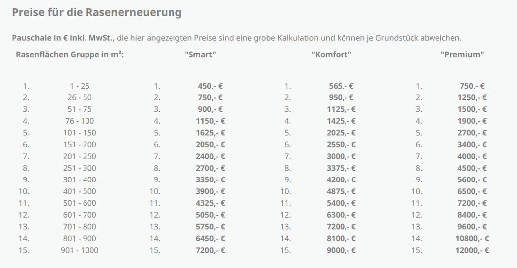 Pauschale in € inkl. MwSt., die hier angezeigten Preise sind eine grobe Kalkulation und können je Grundstück abweichen.